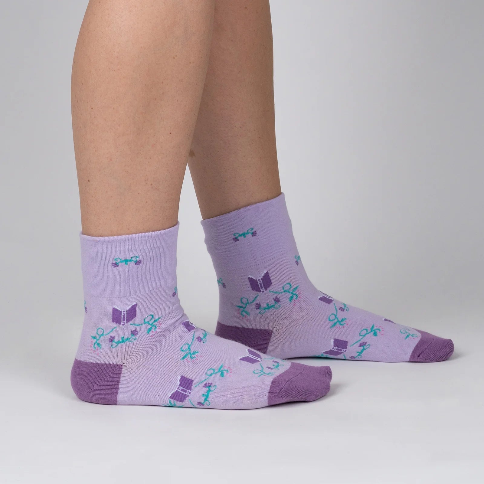 Indulge in the refined charm of our soft-hued socks inspired by the world of reading. These socks blend elegance with comfort for a cozy fit.
