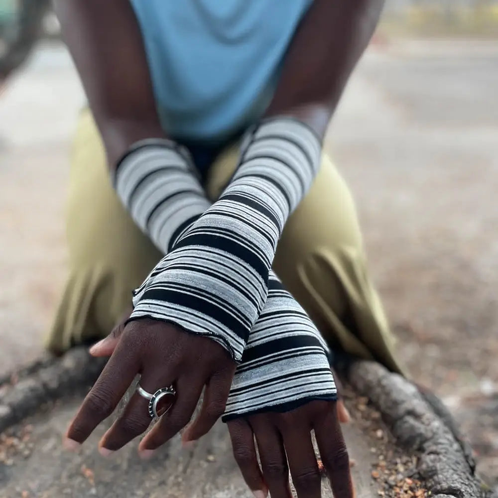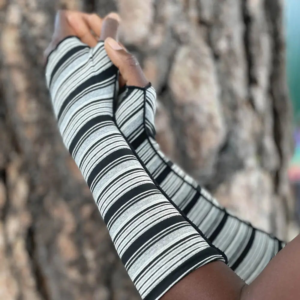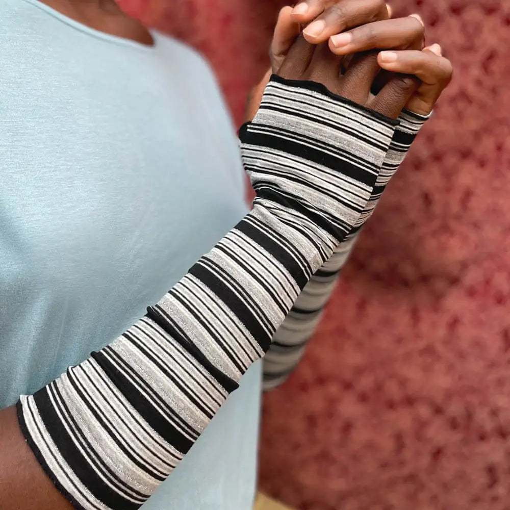 More stripes! These fun black and grey fingerless gloves are made from a soft plant-based striped stretchy rayon jersey.