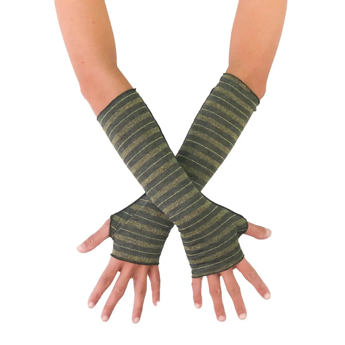 Our thin and lightweight fingerless gloves have subtle gold pinstripes and come in three colors. Spice up your evening wear with this fun accessory.