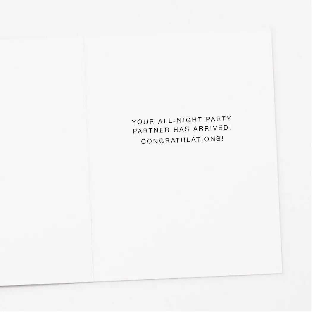 Inside greeting: “YOUR ALL-NIGHT PARTY PARTNER HAS ARRIVED! CONGRATULATIONS!"